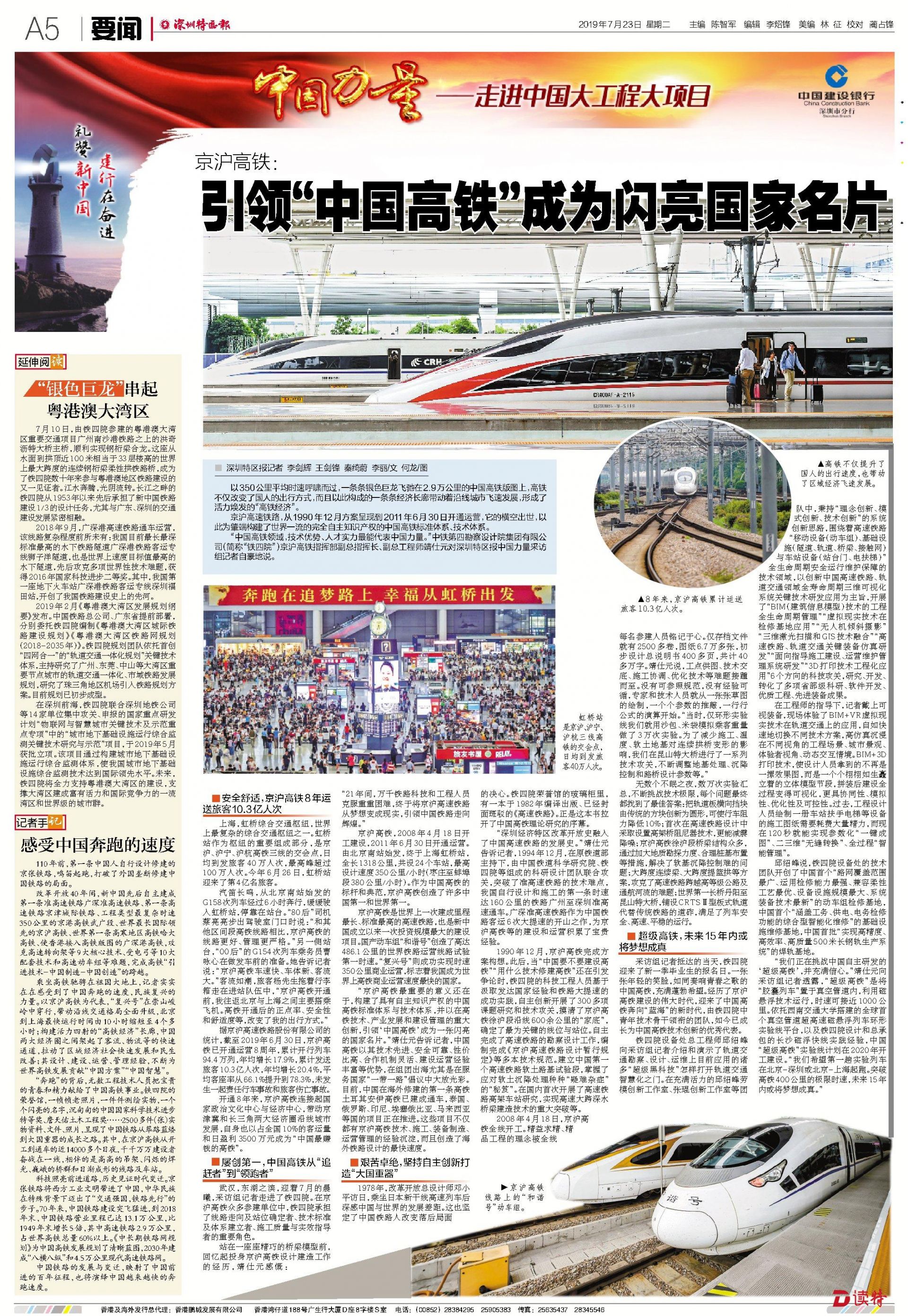 乘坐高鐵馳騁在祖國大地上,記者實(shí)實(shí)在在感受到了中國奔跑的速度,民族復(fù)興的力量。以京滬高鐵為代表,“復(fù)興號(hào)”在崇山峻嶺中穿行,帶動(dòng)沿線交通格局全面升級(jí),北京到上海最快運(yùn)行時(shí)間由10小時(shí)縮短至4個(gè)多小時(shí);構(gòu)建活力四射的“高鐵經(jīng)濟(jì)”長廊,中國兩大經(jīng)濟(jì)圈之間架起了客流、物流等的快速通道,拉動(dòng)了區(qū)域經(jīng)濟(jì)社會(huì)快速發(fā)展和民生改善;其設(shè)計(jì)、建設(shè)、運(yùn)營、管理經(jīng)驗(yàn),不斷為世界高鐵發(fā)展貢獻(xiàn)“中國方案”“中國智慧”。