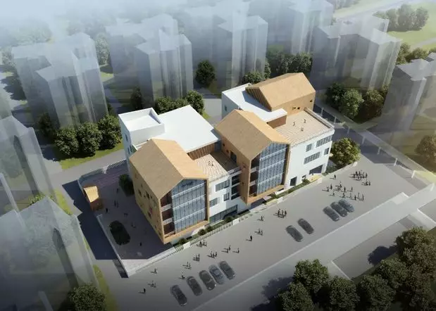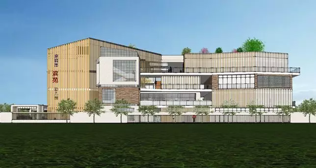 建筑造型簡(jiǎn)潔現(xiàn)代,在白色體量上嵌入三個(gè)木色坡屋頂體塊,如積木城堡一般,富有童趣,建筑設(shè)有集中活動(dòng)平臺(tái)作為補(bǔ)充。