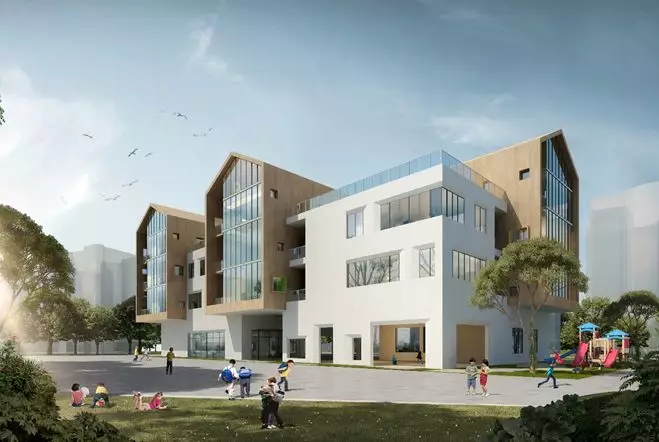 項(xiàng)目打破傳統(tǒng)整齊排列的布局方式,打造出4個(gè)與邊界呼應(yīng)的靈活體塊,在保證幼兒園首層活動(dòng)空間完整最大化的同時(shí),將新舊校舍結(jié)合,打造一個(gè)聯(lián)通式共享庭院。新建校舍為每一個(gè)班級(jí)都提供了專屬的室內(nèi)外無(wú)邊界活動(dòng)空間。除首層班級(jí)與室外活動(dòng)空間直接連通以外,二、三層班級(jí)外設(shè)有錯(cuò)落的活動(dòng)露臺(tái)及挑檐,實(shí)現(xiàn)每層均可嬉戲、游樂(lè)、探索的布局。