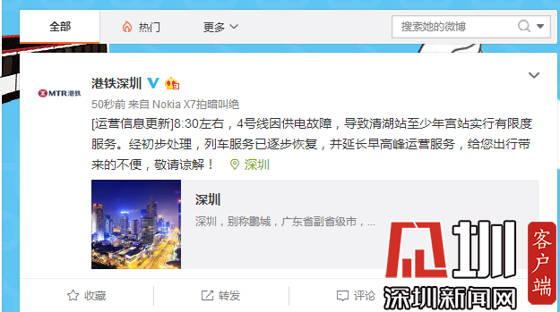 深圳新聞網(wǎng)2019年7月25日訊(見圳客戶端、深圳新聞網(wǎng)記者 韓翔 )7月25日早上,地鐵4號線出現(xiàn)故障,導(dǎo)致部分乘客延誤?!案坭F深圳”發(fā)微博稱目前列車已逐步恢復(fù)服務(wù)。但據(jù)站內(nèi)廣播通知:由于供電故障,深圳地鐵4號線前往福田口岸的列車終點(diǎn)站更改為少年宮站。正值上班高峰期,記者在上塘地鐵站內(nèi)看到大量乘客滯留。