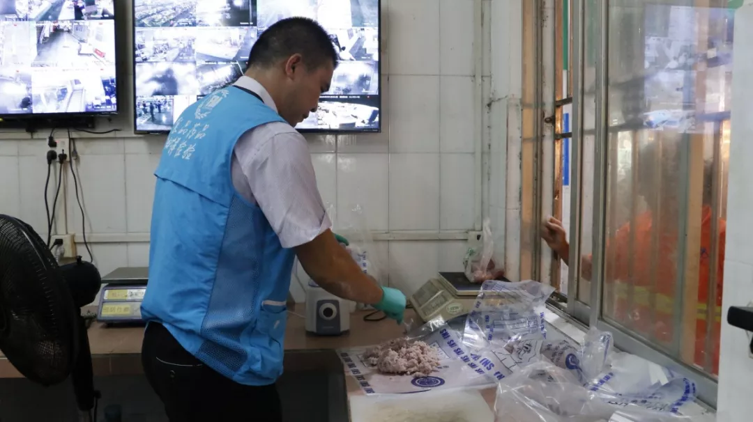 執(zhí)法人員根據市場開辦方提供的市場檔位明細表,首先隨機選取了市場內的肉檔、水產品檔、菜檔,逐一進行檢查,對檔位的營業(yè)執(zhí)照、臺賬建立情況檢查無誤后,執(zhí)法人員又隨機指定了檢查品種,由快檢人員現場開展快檢工作。