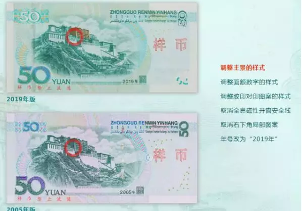 2019年版第五套人民幣50元、20元、10元、1元紙幣分別保持2005年版第五套人民幣50元、20元、10元紙幣和1999年版第五套人民幣1元紙幣規(guī)格、主圖案、主色調(diào)、“中國人民銀行”行名、國徽、盲文面額標記、漢語拼音行名、民族文字等要素不變,提高了票面色彩鮮亮度,優(yōu)化了票面結(jié)構(gòu)層次與效果,提升了整體防偽性能。2019年版第五套人民幣50元、20元、10元、1元紙幣調(diào)整正面毛澤東頭像、裝飾團花、橫號碼、背面主景和正背面面額數(shù)字的樣式,增加正面左側(cè)裝飾紋樣,取消正面右側(cè)凹印手感線和背面右下角局部圖案,票面年號改為“2019年”。