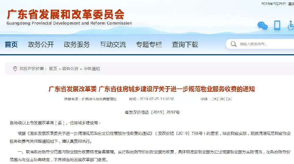 廣東省物業(yè)服務收費規(guī)范新規(guī)定自2019年8月1日起執(zhí)行。實行政府指導價的物業(yè)服務收費,具體標準由物業(yè)服務企業(yè)根據(jù)物業(yè)服務實際情況,在政府指導價范圍內(nèi)與業(yè)主協(xié)商確定,不再報當?shù)匕l(fā)展改革部門備案。