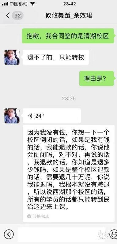 目前,學(xué)員們無法與余效珺保持穩(wěn)定聯(lián)系,但是8月7日與學(xué)員的溝通中,余效珺承認(rèn)清湖校區(qū)需退的學(xué)費(fèi)約有幾十萬,他無力退還,只能建議學(xué)員轉(zhuǎn)到民治校區(qū)上課。