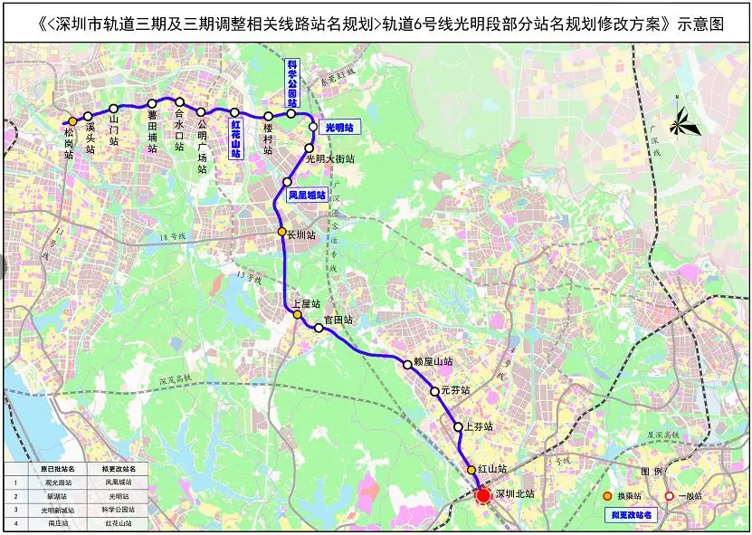▲軌道三期及三期調(diào)整相關(guān)線路站名規(guī)劃6號線光明段部分站名修改方案示意圖