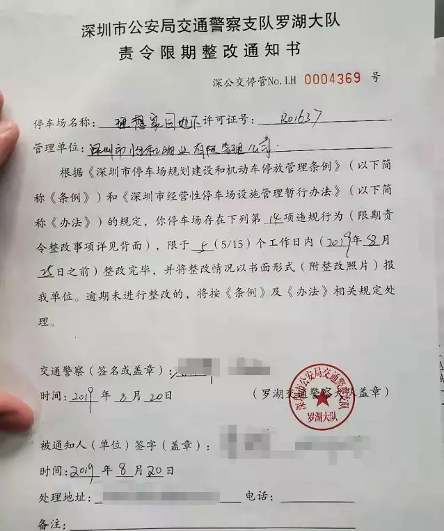 深圳交警巡查至深圳市怡和物業(yè)有限管理公司理想家園地下停車場時,發(fā)現(xiàn)該停車場數(shù)據(jù)未與停車場監(jiān)管系統(tǒng)正常連接,民警按照停車場管理制度向該停車場負責(zé)人開具責(zé)令限期整改通知書。