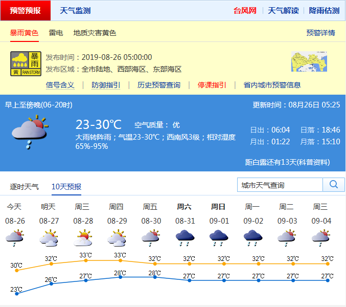 見(jiàn)圳客戶端·深圳新聞網(wǎng)2019年8月26日訊 今年第11號(hào)臺(tái)風(fēng)“白鹿”已經(jīng)于昨日7時(shí)25分在福建省東山縣沿海登陸后,已減弱為熱帶低壓,向西偏北方向移動(dòng),市氣象臺(tái)已于昨日17時(shí)取消臺(tái)風(fēng)白色預(yù)警信號(hào)。據(jù)市氣象局預(yù)計(jì),今日白天大雨轉(zhuǎn)陣雨,降雨減弱;27-29日多云間晴天,天氣趨于悶熱。