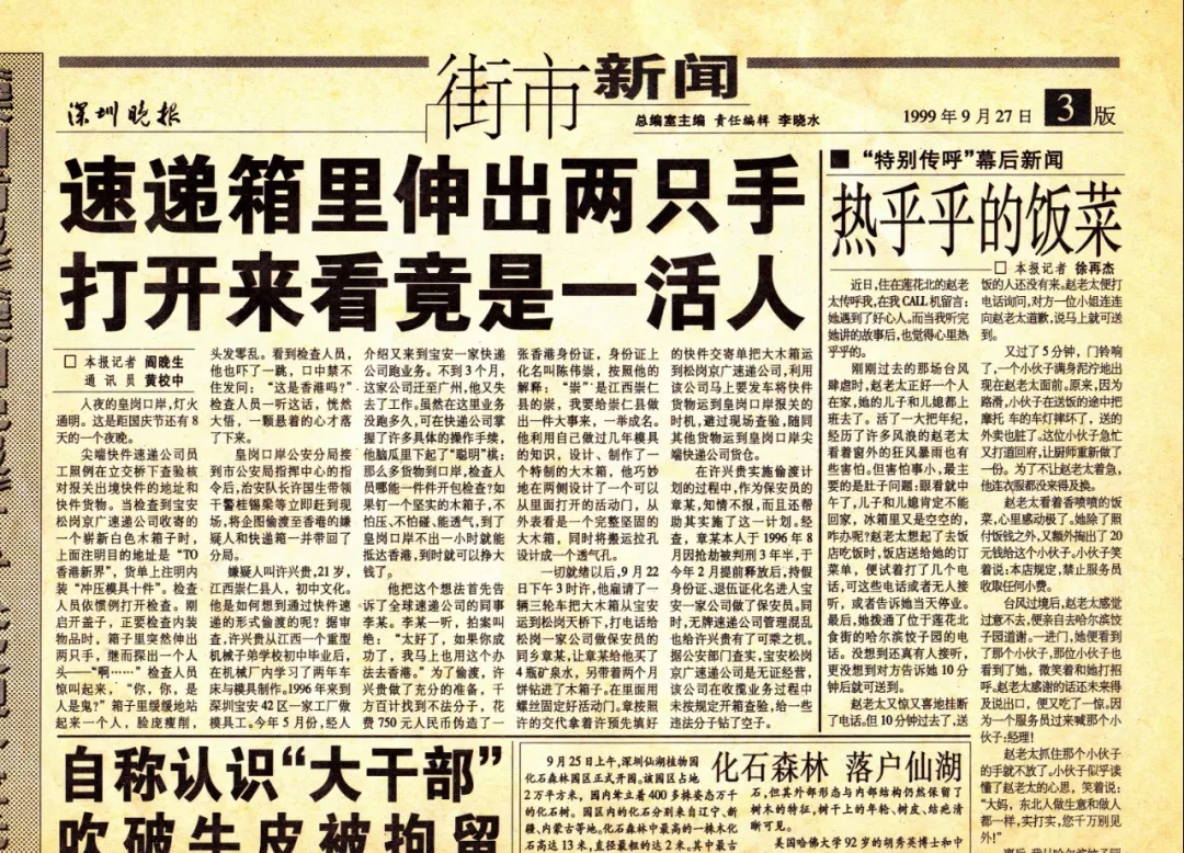而歷史賦予這支鐵軍的特殊使命任務(wù)則是重拳打擊口岸走私和偷渡犯罪?;蕧徔诎杜沙鏊下毠す疱a梁至今還珍藏著一份些許泛黃的舊報紙,一篇名為“速遞箱里伸出兩只手,打開來看竟是一活人”的報道記錄了1999年9月22日曾發(fā)生的一起偷渡案件。作為當(dāng)時參與處置的一員,桂錫梁回憶道,犯罪分子將自己裝進(jìn)一個特制的大木箱中,偽裝成裝有“沖壓模具”發(fā)往香港的快遞箱,計劃偷渡出境,最終在位于皇崗口岸附近的快遞轉(zhuǎn)運點被警方查獲。