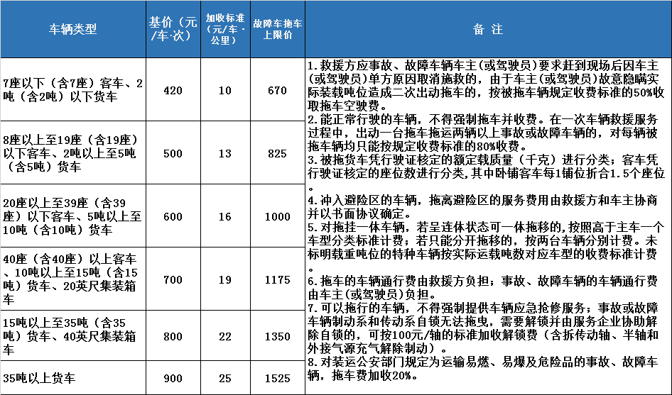 通知中明確,廣東省高速公路救援服務中拖車、吊車服務收費實行政府指導價(上限價)管理,按“誰委托、誰付費”的原則收取。拖車里程按被拖車輛起拖點至停放點距離計算,拖車服務收費包含基價和10公里以外加收兩部分。