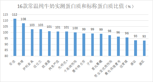 本次16款常溫純牛奶蛋白質(zhì)實際檢出值和標稱值的比值在93%~112%,符合要求范圍。表現(xiàn)最好的是安佳、燕塘、伊利金典和紐仕蘭。德運和德亞表現(xiàn)欠佳。