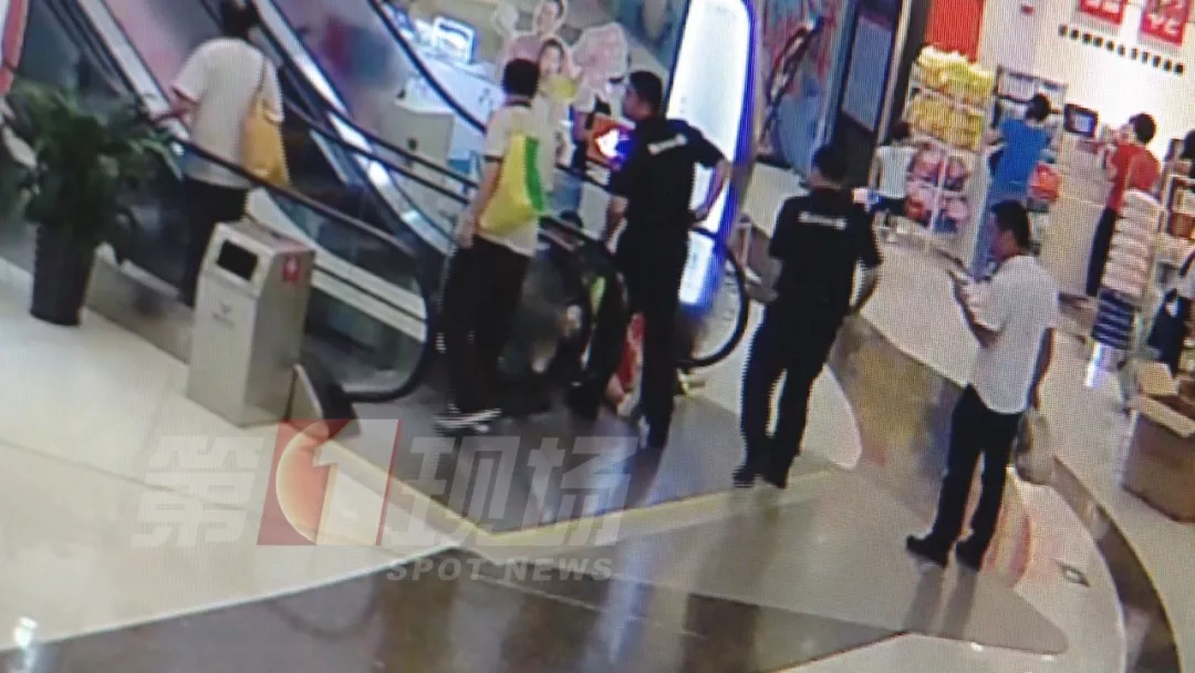 在商場的自動扶梯上,兒子的洞洞鞋被卷進了扶梯的空隙導(dǎo)致腳拔不出來。