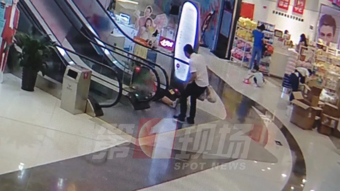 坪山嘉鄰中心商場的監(jiān)控顯示:下午3點左右,李女士帶著2歲多的兒子,從商場二樓下到一樓,在自動扶梯上,李女士突然蹲下來拉住了兒子的右腿,大聲呼救。