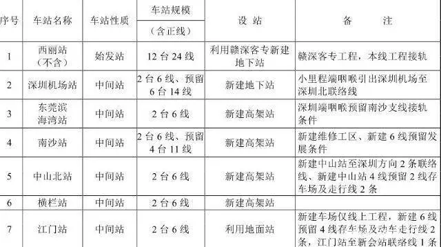 新建深茂鐵路深圳至江門段為高速鐵路,雙線。正線西麗至南沙段及深圳北至深圳機(jī)場聯(lián)絡(luò)線時(shí)速200公里,正線南沙至江門段時(shí)速250公里;新建設(shè)西麗、深圳機(jī)場、濱海灣、南沙、中山北、橫欄、江門共7座車站。