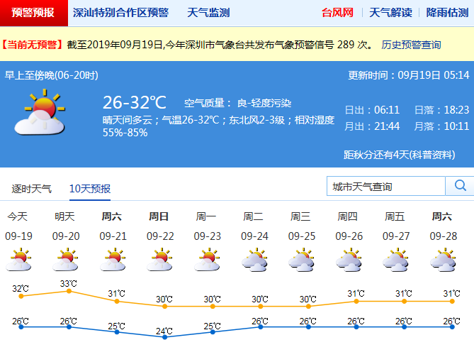 見圳客戶端·深圳新聞網(wǎng)2019年9月19日訊 記者從深圳市氣象局獲悉19日晴天間多云,氣溫26-33℃;20-23日持續(xù)晴熱干燥。其中菲律賓以東洋面的熱帶擾動(dòng)云團(tuán)正在發(fā)展,預(yù)計(jì)其總體趨勢(shì)北上,對(duì)我市以及華南沿海無明顯風(fēng)雨影響,但20日前后將受其外圍偏北下沉氣流影響。