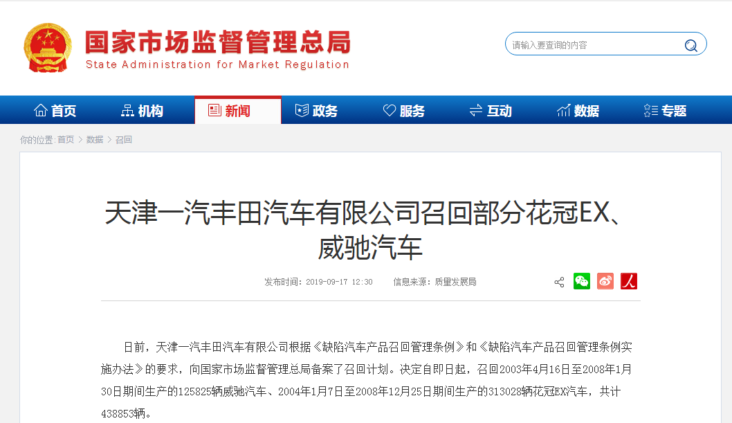 日前,天津一汽豐田汽車有限公司根據(jù)《缺陷汽車產(chǎn)品召回管理?xiàng)l例》和《缺陷汽車產(chǎn)品召回管理?xiàng)l例實(shí)施辦法》的要求,向國家市場(chǎng)監(jiān)督管理總局備案了召回計(jì)劃。決定自即日起,召回2003年4月16日至2008年1月30日期間生產(chǎn)的125825輛威馳汽車、2004年1月7日至2008年12月25日期間生產(chǎn)的313028輛花冠EX汽車,共計(jì)438853輛。