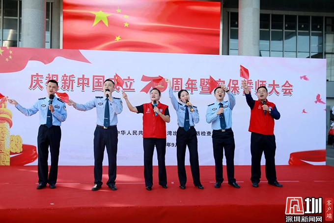 大會現(xiàn)場,一面巨幅國旗在12名邊檢民警的護衛(wèi)下,在會場正中位置迎風拂動;國旗兩側,由深圳灣邊檢站民警、地方公安民警、駐地武警官兵、口岸輔警及口岸U站志愿者組成的方陣依次排列。
