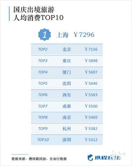 而國慶假期國人出境游花費多少錢?據(jù)攜程出境游數(shù)據(jù)顯示,國慶通過攜程旅游平臺報名跟團(tuán)游、自由行、定制游等度假產(chǎn)品的人均花費是國內(nèi)游價格的近2倍。出境游消費力前十名出發(fā)城市為上海、北京、重慶、廈門、沈陽、西安、成都、南京、杭州和深圳。上海和北京出境游人均花費超過了7000元,遠(yuǎn)遠(yuǎn)超過了其他城市。
