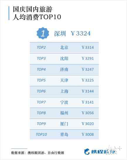 哪些城市居民的平均消費最高?根據(jù)攜程跟團(tuán)游和自由行數(shù)據(jù),“國內(nèi)游消費力前十強城市”依次為深圳、北京、沈陽、濟(jì)南、天津、上海、寧波、福州、廈門和青島。這些城市國慶旅游單次國內(nèi)游人均花費超過3000元,其中深圳人最舍得花錢,單次國內(nèi)旅游人均花費達(dá)到了3324元。