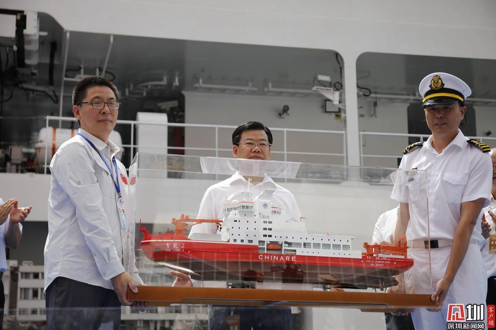 在活動(dòng)現(xiàn)場,南極科考隊(duì)向深圳市人民政府贈(zèng)送了比例1:100“雪龍2”號(hào)船船模紀(jì)念品,隨后,南極科考隊(duì)向招商局集團(tuán)贈(zèng)送全體科考隊(duì)員簽名的隊(duì)旗等。此外,黃敏副市長率隊(duì)登船參觀、慰問考察隊(duì)員,并與考察隊(duì)員親切交流座談。