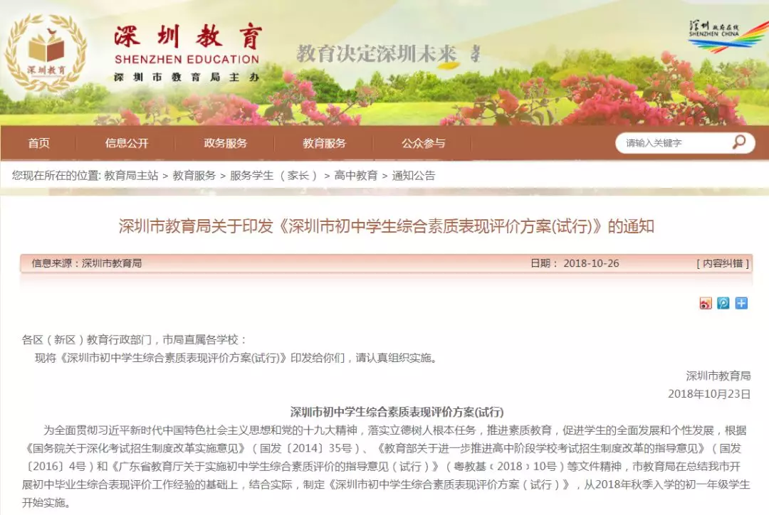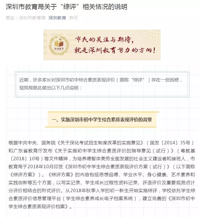 《深圳市初中學(xué)生綜合素質(zhì)表現(xiàn)評價(jià)方案(試行)》(以下簡稱《綜評方案》)于2018年10月印發(fā)。