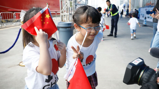2019年10月14日,蛇口游輪母港CR2碼頭,兩位即將參觀“雪龍2”號科考破冰船的孩子們對起鏡頭比起手勢。
