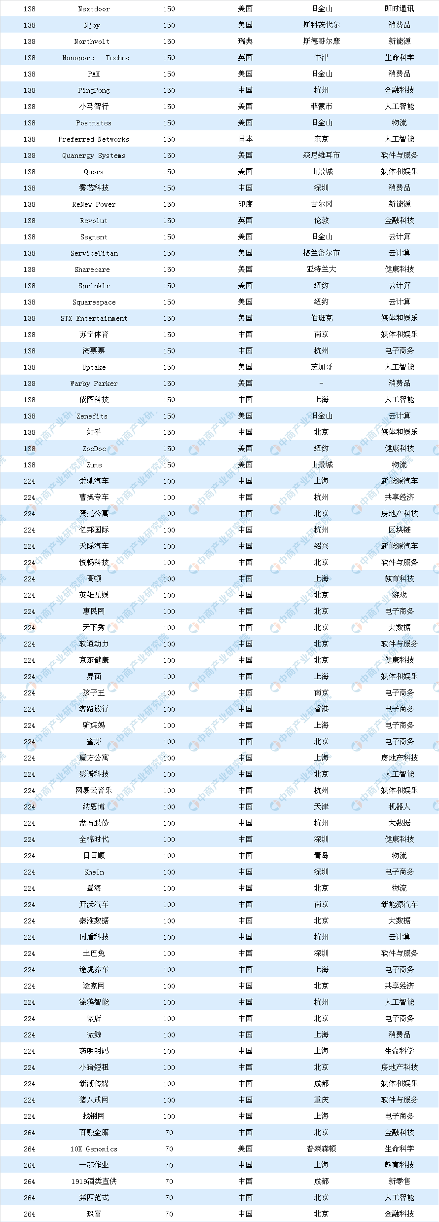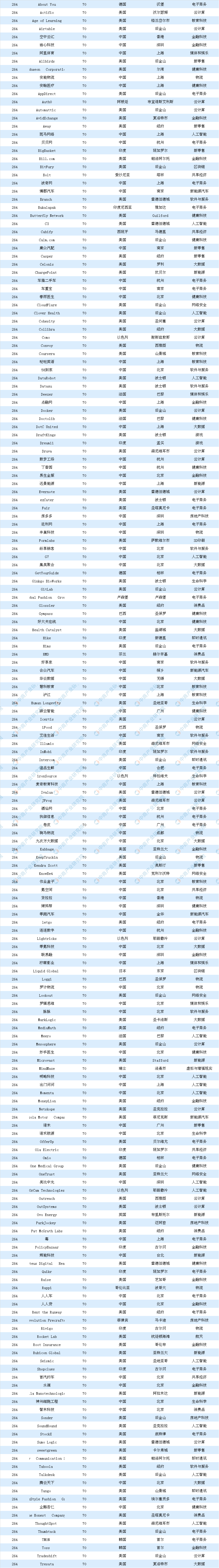 全球獨(dú)角獸榜單前十名的還有Infor、JUUL Labs、陸金所、愛彼迎、SpaceX、WeWork、Stripe??偛课挥谏虾5年懡鹚怯芍袊?guó)平安孵化的理財(cái)平臺(tái),已從春華資本、中糧集團(tuán)和國(guó)際私募股權(quán)基金B(yǎng)lackPine等融資30億美元。另有微眾銀行、菜鳥網(wǎng)絡(luò)、京東數(shù)科、快手、大疆、京東物流、水滴等中國(guó)公司上榜。