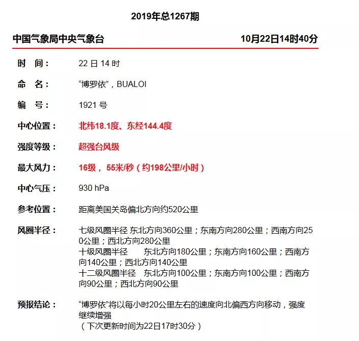 今年第21號臺(tái)風(fēng)“博羅依”已于10月22日凌晨加強(qiáng)為強(qiáng)臺(tái)風(fēng)級,早晨5點(diǎn)鐘其中心位于美國關(guān)島北偏東方向約370公里的西北太平洋洋面上,就是北緯16.7度、東經(jīng)145.5度,中心附近最大風(fēng)力有14級(42米/秒),中心最低氣壓為955百帕,七級風(fēng)圈半徑180-280公里,十級風(fēng)圈半徑100-160公里,十二級風(fēng)圈半徑50-80公里。