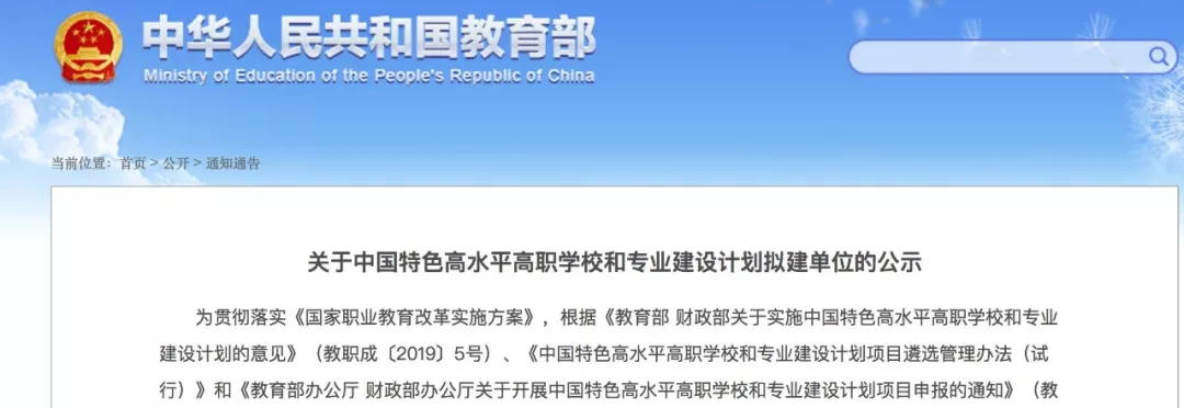 2019年4月1日,教育部、財政部聯(lián)合印發(fā)《關于實施中國特色高水平高職學校和專業(yè)建設計劃的意見》,提出要集中力量建設50所左右高水平高職學校和150個左右高水平專業(yè)群,打造技術技能人才培養(yǎng)高地和技術技能創(chuàng)新服務平臺。