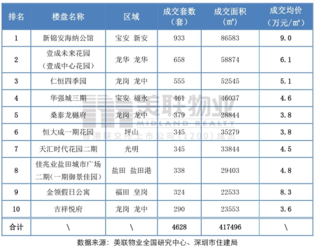 2019年第三季度深圳全市商品住宅成交量TOP10