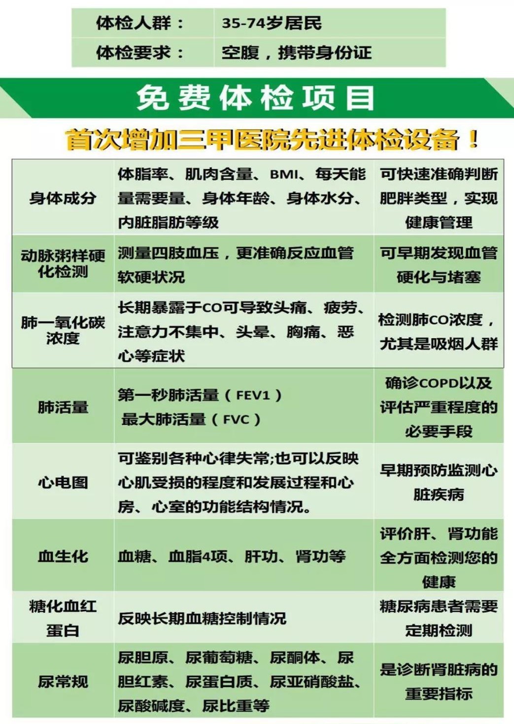 本次免費體檢面向35-74歲深圳居民,主要為居民提供的體檢項目包括:免費建立健康檔案,中醫(yī)體質辨識服務;免費檢測尿常規(guī)、血常規(guī);免費檢測血生化(血糖、肝功、腎功);免費做心電圖檢查;免費測量肺功能、肺一氧化碳含量;免費測量身體成份,判別自身的健康狀態(tài)。需要提醒的是,體檢要求空腹,且要攜帶身份證。