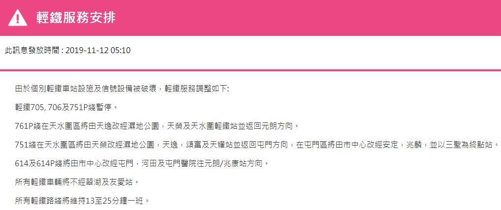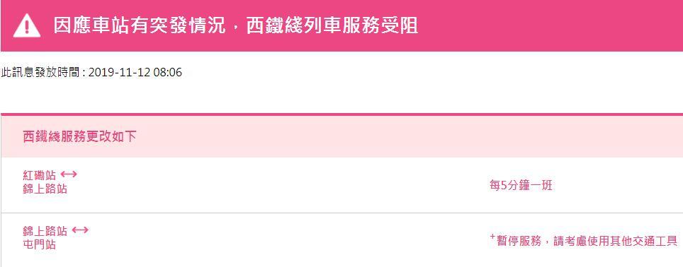 據(jù)港鐵官網(wǎng)目前最新消息,東鐵線列車運營服務調(diào)整為:紅磡站至火炭站每6分鐘一班;火炭站至大埔墟站暫停服務;大埔墟站至羅湖站每15分鐘一班;大埔墟站至落馬洲站每20分種一班。港鐵其他線路也有多處調(diào)整。