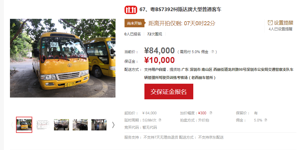 競買人應(yīng)于拍賣會前在京東拍賣平臺進(jìn)行實(shí)名登記注冊,注冊成功后請按京東拍賣平臺的提示進(jìn)行操作;競買人在對拍賣標(biāo)的物首次確認(rèn)出價(jià)競拍前,按系統(tǒng)提示報(bào)名繳納10000元/輛的保證金;在競價(jià)過程中,請競買人按規(guī)定的加價(jià)幅度300元出價(jià),若自行出價(jià),請仔細(xì)核對好出價(jià)金額,若出現(xiàn)出價(jià)金額錯誤的情況,由買受人自行承擔(dān)后果;拍賣成交后,買受人請于拍賣成交之時(shí)起72小時(shí)內(nèi)全額支付拍賣成交價(jià)款、拍賣傭金、增值稅及附加、機(jī)動車轉(zhuǎn)移登記車牌費(fèi),并到廣東華士德(深圳)拍賣行有限公司所在地(深圳市羅湖區(qū)中興路219號華興酒店4樓)簽署《拍賣成交確認(rèn)書》及辦理相關(guān)手續(xù)。