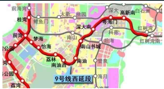 地鐵9號(hào)線西延線(二期)線路東起紅樹灣南站,經(jīng)深圳灣至前海灣,全長(zhǎng)約10.8公里,站點(diǎn)為前灣、夢(mèng)海、怡海、荔林、南油西、南油、南山書城、深大南、粵海門、高新南、紅樹灣南。其中,換乘站為5座,在前灣站換乘5號(hào)線、南油站換乘12號(hào)線、深大南站換乘15號(hào)線、粵海門站換乘13號(hào)線、紅樹灣站換乘11號(hào)線。