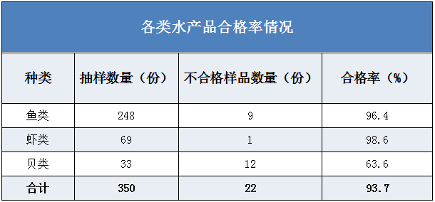 此外,水產(chǎn)品中魚(yú)類(lèi)不合格樣品數(shù)量為9份;蝦類(lèi)1份;貝類(lèi)12份樣品不合格。