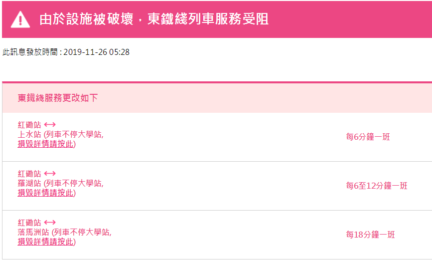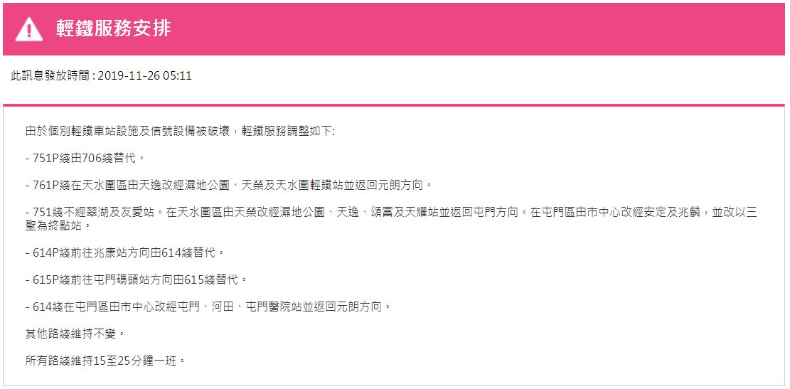 據(jù)港鐵消息,11月26日,香港地鐵各線(機(jī)場快線除外)、輕鐵及港鐵巴士的服務(wù)將于晚上11:30時結(jié)束。大學(xué)站繼續(xù)關(guān)閉,列車不停大學(xué)站。個別車站出入口也會暫時關(guān)閉。