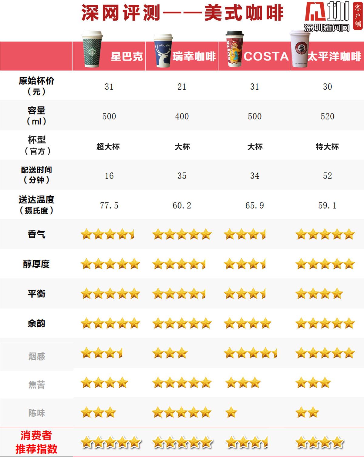 深圳新聞網(wǎng)測(cè)評(píng)小組聯(lián)合專注產(chǎn)品質(zhì)量、消費(fèi)服務(wù)專業(yè)組織中國(guó)質(zhì)量萬里行,邀請(qǐng)了來自新聞、餐飲、IT以及其他行業(yè)的20位咖啡愛好者,對(duì)深圳市面上主流的星巴克、瑞幸、太平洋、COSTA4個(gè)品牌,2種口味【“拿鐵(熱)”、“美式(熱)”】的咖啡,通過主觀+客觀的形式進(jìn)行了測(cè)評(píng)。