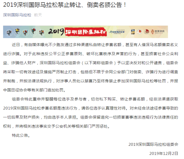 12月2日,深馬組委會發(fā)布公告,對于此種違反公平公正參賽原則、破壞比賽秩序及聲譽的行為,甚至損害社會公眾利益、詐騙他人財產(chǎn),深圳國際馬拉松組委會(以下簡稱組委會)予以堅決反對和公開譴責(zé)。
