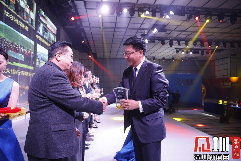 深圳報(bào)業(yè)集團(tuán)社長(zhǎng)助理、深新傳媒董事長(zhǎng)吉書龍為榮獲“年度公益先鋒力量”的單位代表頒獎(jiǎng)。