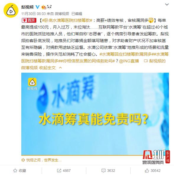 見圳客戶端.深圳新聞網(wǎng)2019年12月6日訊(見圳客戶端、深圳新聞網(wǎng)記者 張玲)2019年11月30日,據(jù)梨視頻報(bào)道,互聯(lián)網(wǎng)籌款平臺(tái)“水滴籌”在超過40個(gè)城市的醫(yī)院派駐地推人員,線下地推服務(wù)人員被指在醫(yī)院“掃樓”尋找求助者,套用模板,隨意填寫金額,不審核甚至隱瞞求助者財(cái)產(chǎn)狀況,鼓勵(lì)患者大量轉(zhuǎn)發(fā)籌款信息。同日,水滴籌通過微博官方認(rèn)證公眾號(hào)回應(yīng)稱,已第一時(shí)間成立緊急工作小組開展相關(guān)情況排查,同時(shí)線下服務(wù)團(tuán)隊(duì)全面暫停服務(wù),整頓徹查類似違規(guī)行為,并對(duì)梨視頻報(bào)道可能引發(fā)的誤解進(jìn)行了3點(diǎn)說明。