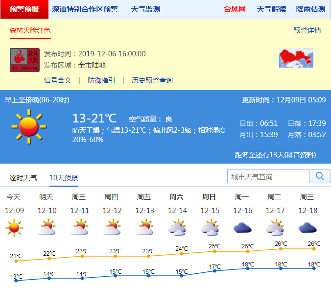 今日起氣溫逐日回升。深圳市氣象臺預(yù)測,9-11日晴天間多云,空氣非常干燥,氣溫逐日小幅度回升;12-13日晴天間多云,空氣干燥;14-16日,云量增多,濕度增大,氣溫繼續(xù)回升。天氣持續(xù)干燥,請注意用火安全。