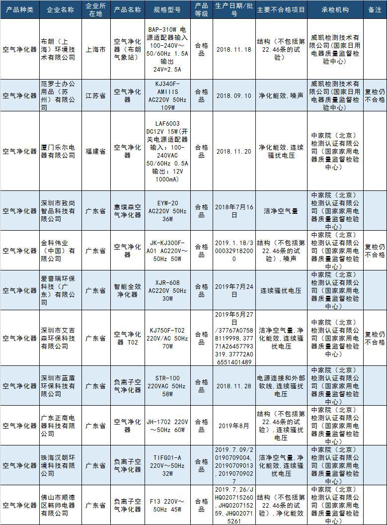 11批次不合格空氣凈化器產品名單