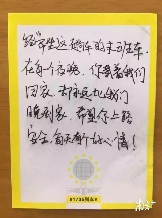 紙條上寫(xiě)著:“經(jīng)常坐這趟車(chē)的末班車(chē),在每個(gè)夜晚,你載著我們回家,卻永遠(yuǎn)比我們晚到家,希望你上路安全,每天有個(gè)好心情!”