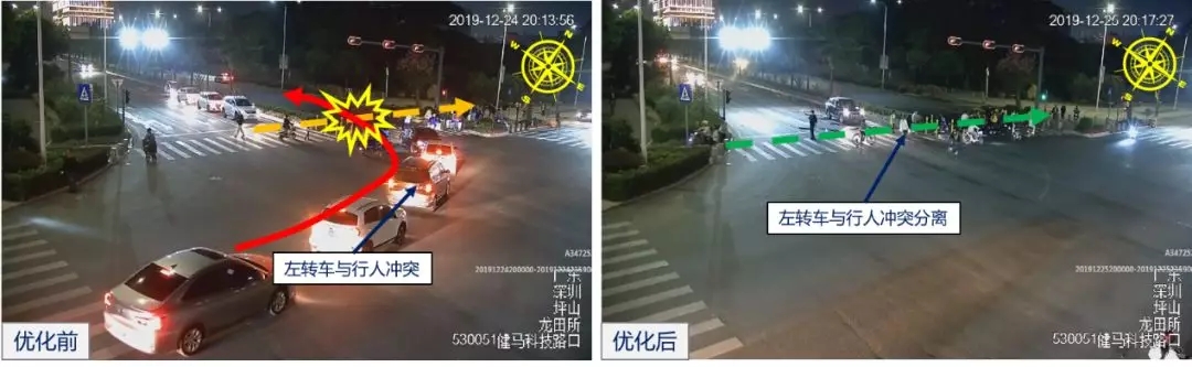 優(yōu)化改善后,路口夜間周期由102秒下降至87秒,路口空放明顯減少;人、車交叉沖突點數(shù)由2個減少至0個,基本實現(xiàn)人車獨立通行路權,行人過街安全得以保障。