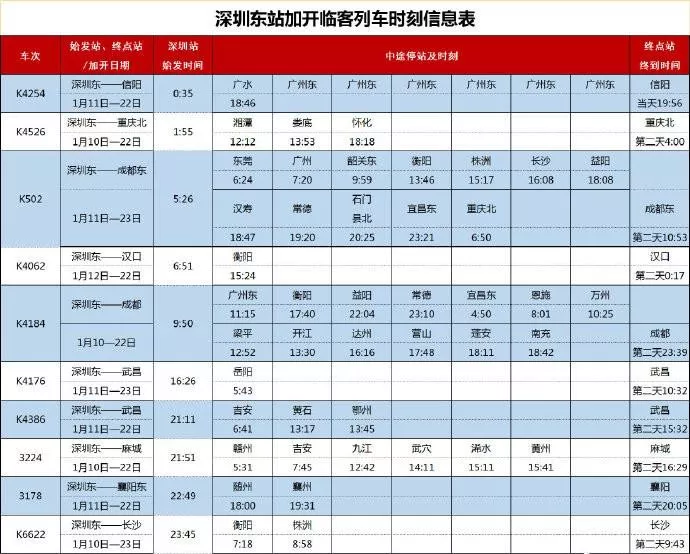 深圳東站加開的10趟臨客列車分別開往四川、重慶、河南、湖北以及湖南等地。