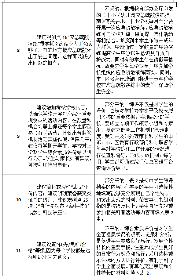 市教育局通報指出,在意見征集期間,該局共收到304個郵件及2個信件。市教育局對上述建議進行了統(tǒng)一的分類,這些建議被分成了34類,并組織了專家學者進行了認真研究。其中,有關平臺簡化、允許修改更新、建立綜評宣導隊伍等14類建議被采納,另有5類建議被部分采納,余下15類建議沒有被采納。
