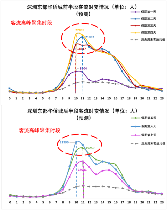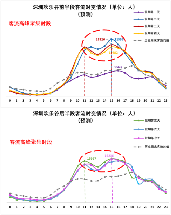 2、市內(nèi)熱門景區(qū)方面:預(yù)計(jì)1月25日至1月30日(正月初一至正月初六)深圳歡樂(lè)谷在11:00-12:00和15:00-16:00出現(xiàn)客流高峰、東部華僑城在10:00-11:00出現(xiàn)客流高峰;預(yù)計(jì)1月25日至1月27日(正月初一至正月初三),歡樂(lè)海岸在15:00前后出現(xiàn)客流高峰。
