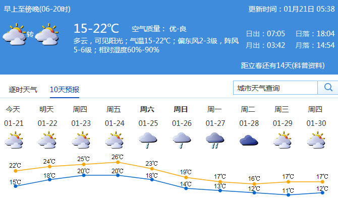 見(jiàn)圳客戶端·深圳新聞網(wǎng)2020年1月21日訊 據(jù)深圳市氣象臺(tái)消息,今日深圳多云,可見(jiàn)陽(yáng)光;氣溫15-22℃;偏東風(fēng)2-3級(jí),陣風(fēng)5-6級(jí);相對(duì)濕度60%-90%。預(yù)計(jì)早晨天氣偏涼,出門注意保暖,預(yù)防感冒。