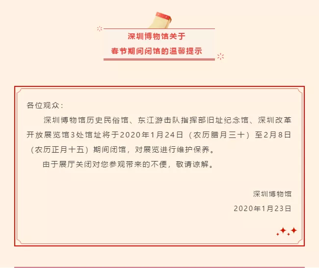 深圳博物館歷史民俗館、東江游擊隊(duì)指揮部舊址紀(jì)念館、深圳改革開(kāi)放展覽館3處館址將于2020年1月24日(農(nóng)歷臘月三十)至2月8日(農(nóng)歷正月十五)期間閉館,對(duì)展覽進(jìn)行維護(hù)保養(yǎng)。由于展廳關(guān)閉對(duì)您參觀帶來(lái)的不便,敬請(qǐng)諒解。