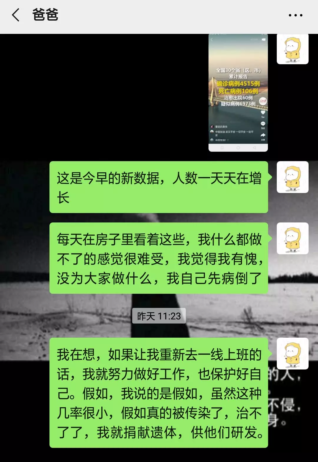 高強度的密閉性工作,李生蘭病倒了,病床上她依然數(shù)次“請戰(zhàn)”。在發(fā)給爸爸的微信中,她寫道,“假如我倒在了崗位上,請捐獻我的遺體!”把我的遺體捐獻,我希望能為這次疫情做點什么!