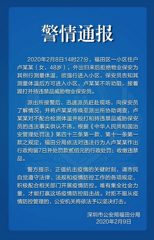 2020年2月8日14時27分,福田區(qū)一小區(qū)住戶盧某某(女,48歲),外出歸來后拒絕物業(yè)保安為其例行測量體溫,欲強行進入小區(qū),保安員告知其測量體溫后方可進入小區(qū),盧某某不聽勸阻,接著踢打并持違禁品威脅物業(yè)保安員。
